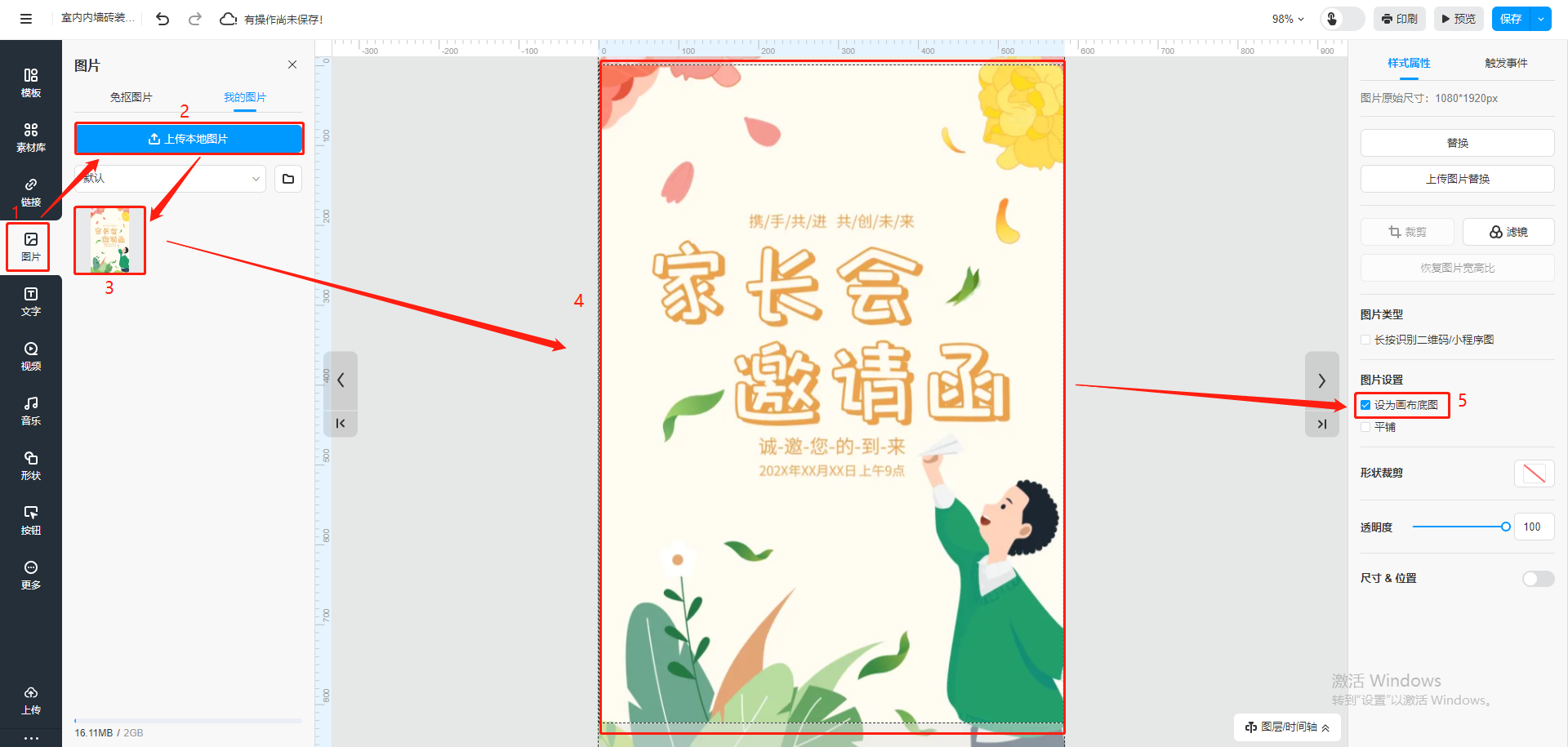 選擇【圖片】,點擊【上傳本地圖片】上傳圖片,點擊上傳好的圖片添加到頁面中,勾選【設為畫布底圖】。