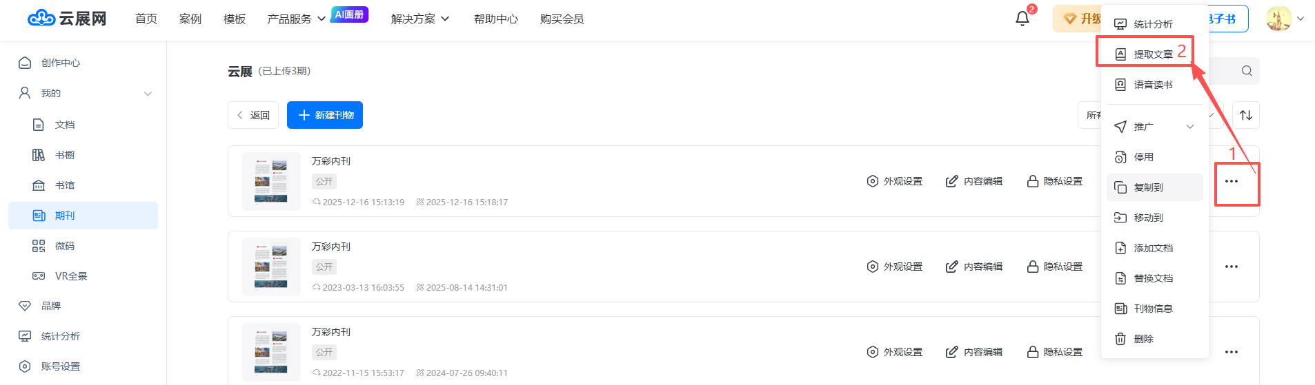 找到對應(yīng)的書,點(diǎn)擊【…】,點(diǎn)擊【提取文章】進(jìn)入編輯頁面。