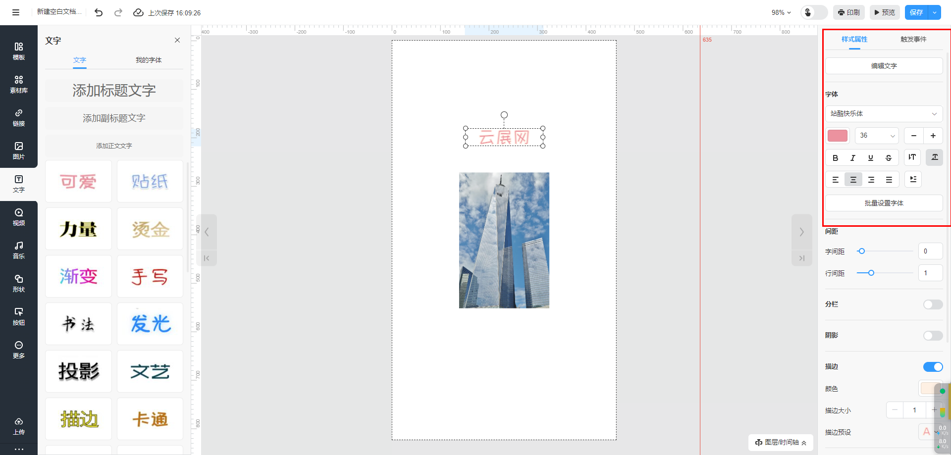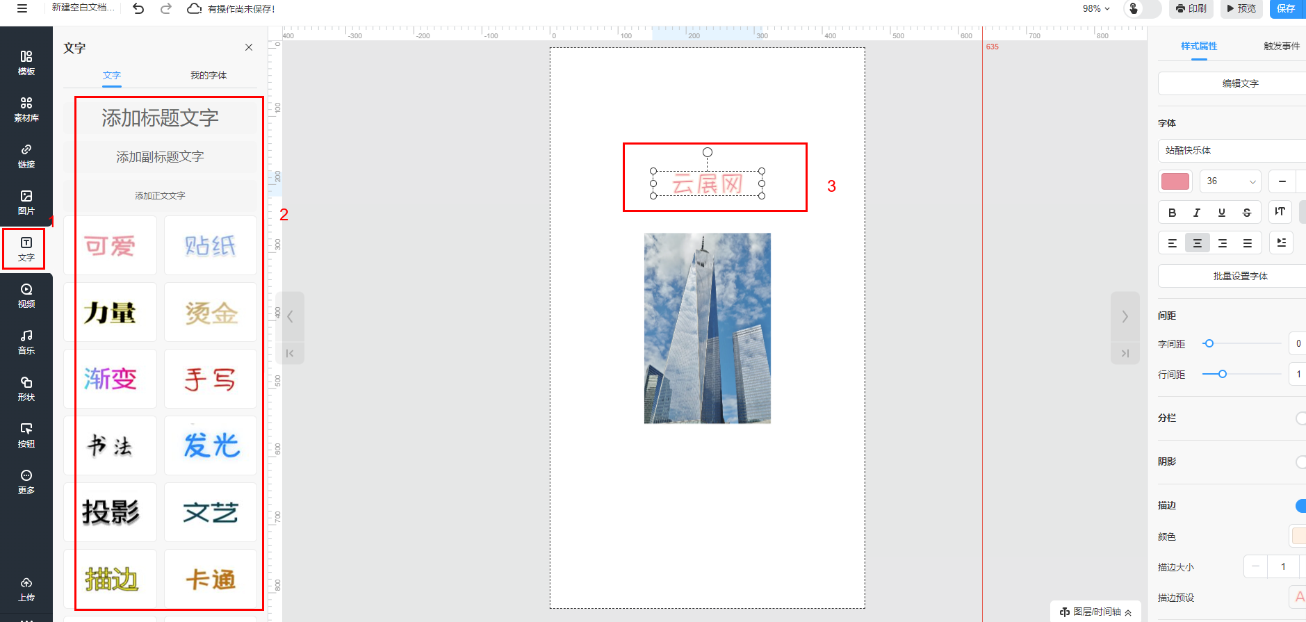 選擇【文字】進(jìn)入文字界面,單擊/拖拽文字類(lèi)型添至電子書(shū)頁(yè)面,并雙擊文字框輸入文本內(nèi)容。也可以選擇云展提供的藝術(shù)字進(jìn)行設(shè)計(jì)。