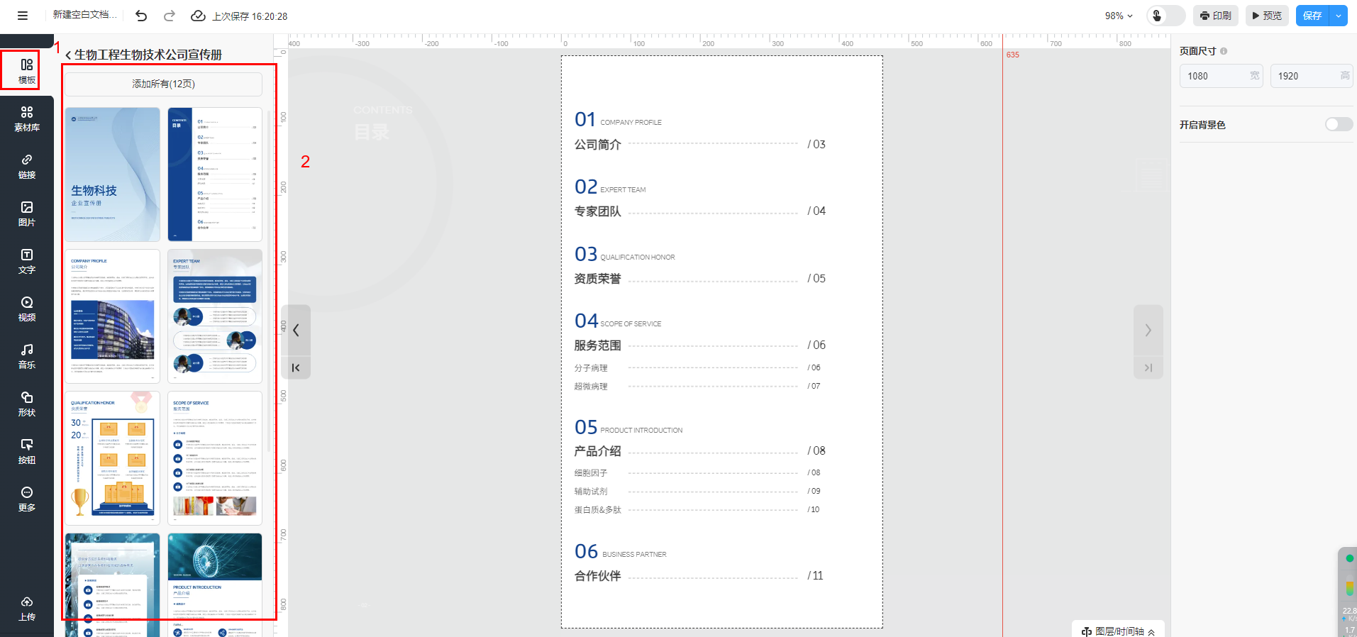 選擇【模板】進(jìn)入模板界面,挑選心儀模板并選擇應(yīng)用模板全部頁(yè)面或其中一頁(yè)。