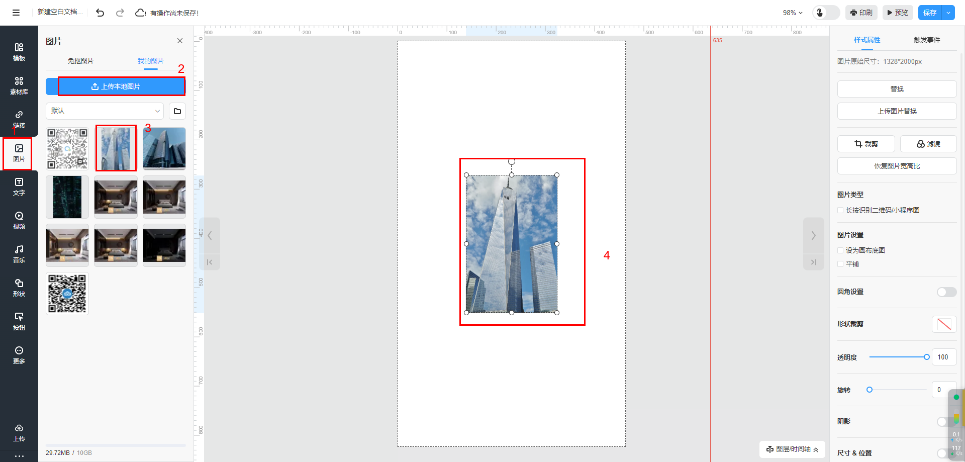 選擇【圖片】進(jìn)入圖片界面,可以上傳你本地的圖片,上傳圖片后選中圖片添至電子書(shū)頁(yè)面,通過(guò)鼠標(biāo)拖拽調(diào)整圖片的位置大小。