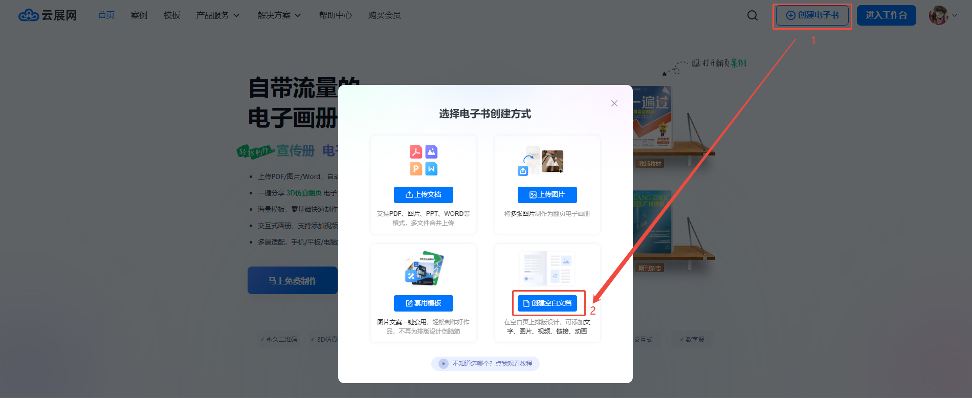 進(jìn)入云展網(wǎng)首頁(yè),登錄你的賬號(hào),點(diǎn)擊【免費(fèi)制作】,進(jìn)入電子書(shū)創(chuàng)建方式操作界面后,點(diǎn)擊【創(chuàng)建空白文檔】