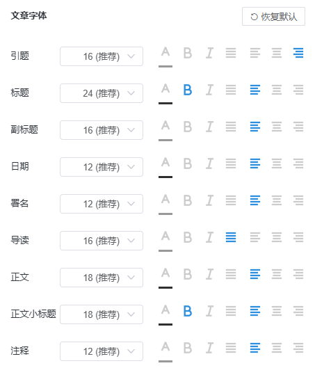 文章設置 一 功能介紹 文章設置,可以對文章的頭尾部展示圖,字體大小,間距,熱區(qū)顏色進行配置。 二 操作步驟 1 設置文字頭圖尾圖 給文章上下兩邊設置圖片,可以用于展示廣告宣傳圖之類的,并且可以設置圖片跳轉鏈接。 2 字體 設置字體大小,對齊等樣式 3 段落與排版 設置字/段落間距。 4 文字熱區(qū)顏色 設置熱區(qū)展示顏色,提醒讀者可以點擊。 5 文章內容允許復制 開啟:彈出文章內容的文字可以復制; 關閉:彈出文章內容的文字不能復制。