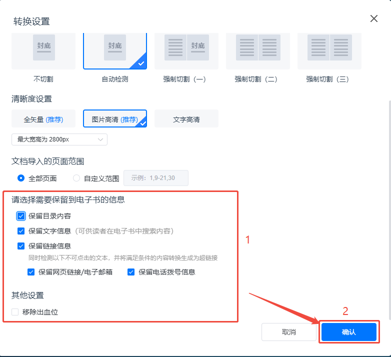 根據(jù)自身需要,勾選需要保留的信息即可,如果上傳的PDF上有出血位可以勾選【移除出血位】,點(diǎn)擊【確認(rèn)】即可。