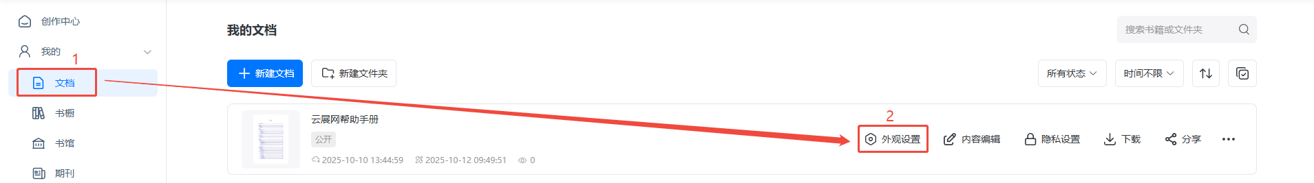 在【文檔】找到需要設(shè)置的電子畫冊(cè),點(diǎn)擊【外觀設(shè)置】進(jìn)入。