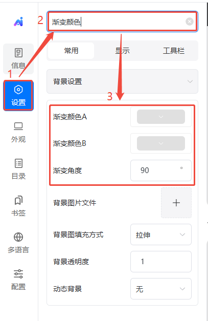 點(diǎn)擊【設(shè)置】,在上方搜索欄搜索【漸變顏色】,然后在下方【漸變顏色A】和【漸變顏色B】分別選擇一個(gè)顏色,最后調(diào)整【漸變角度】即可。