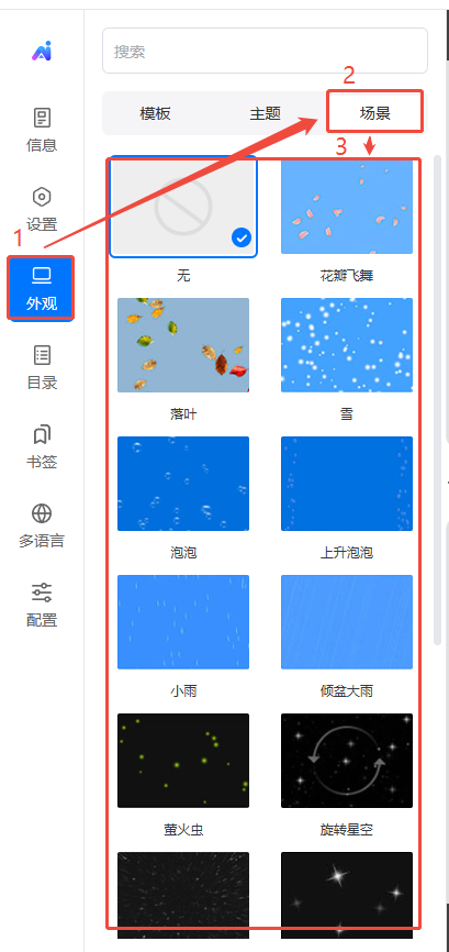 點(diǎn)擊【外觀】,然后點(diǎn)擊【場(chǎng)景】,在下方選擇一個(gè)場(chǎng)景單擊應(yīng)用即可。