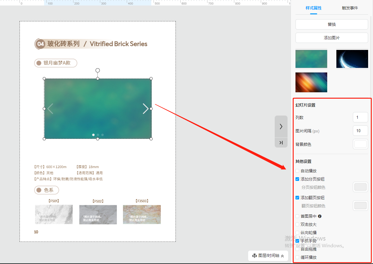 點(diǎn)擊【更多】,選擇【幻燈片】,挑選一個幻燈片的樣式,頁面會出現(xiàn)一個幻燈片組件