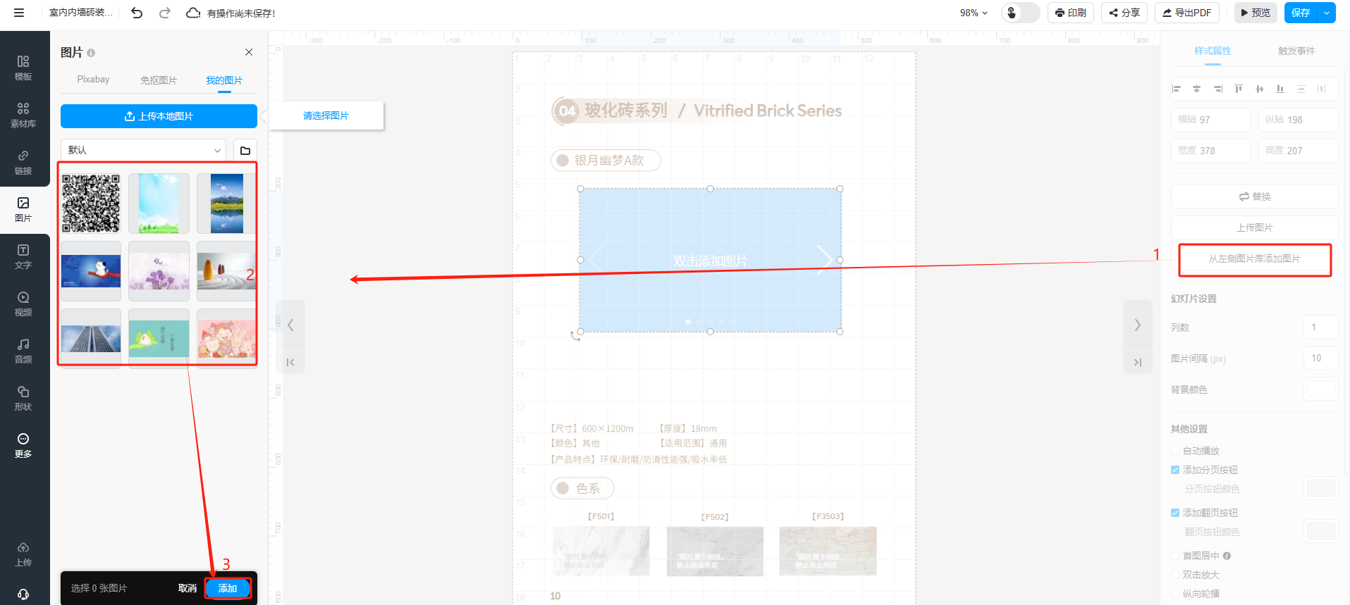 點(diǎn)擊【從左側(cè)圖片庫添加圖片】,在左側(cè)的圖片庫選擇圖片后,點(diǎn)擊【添加】,將圖片添加到幻燈片中