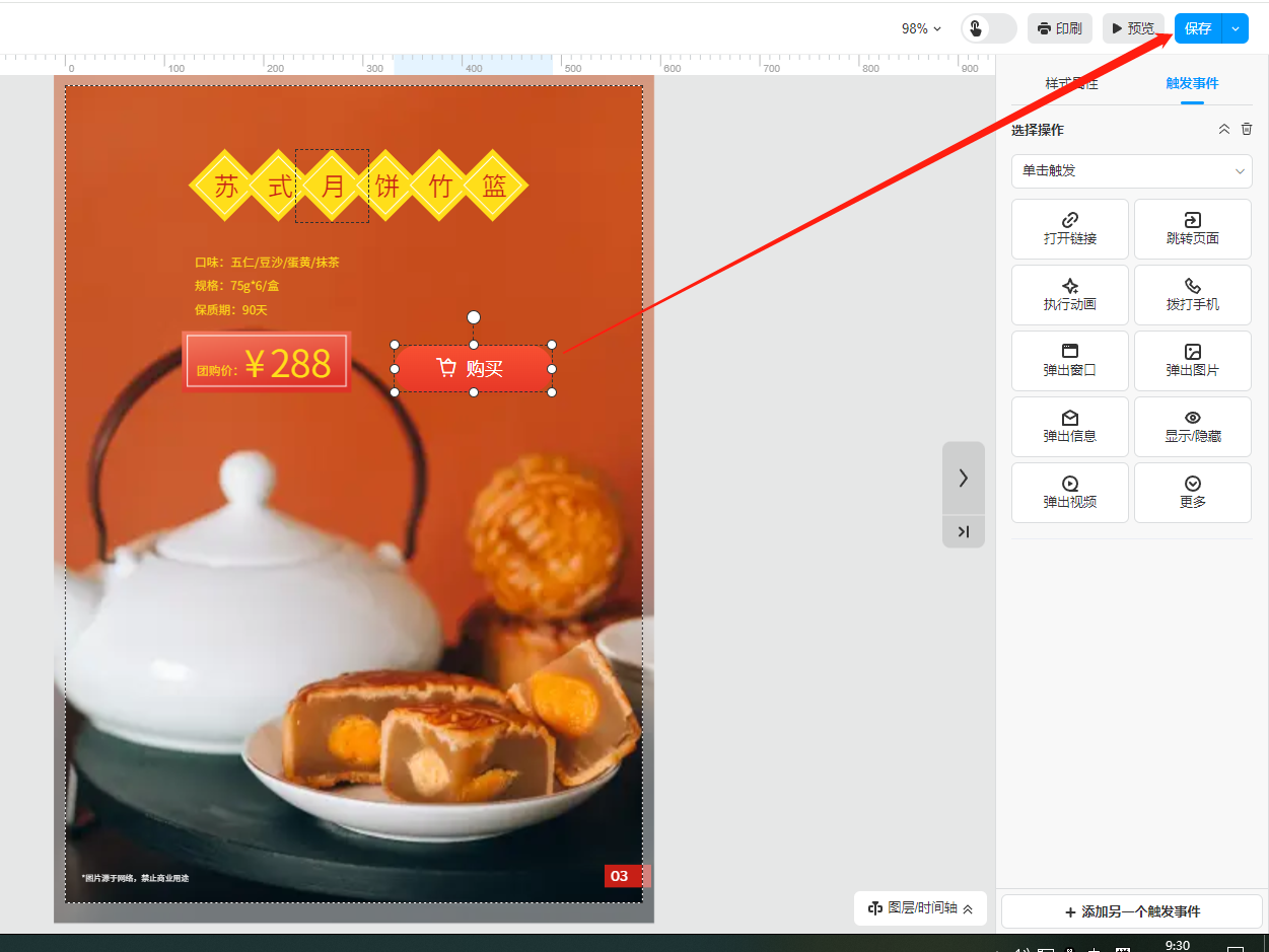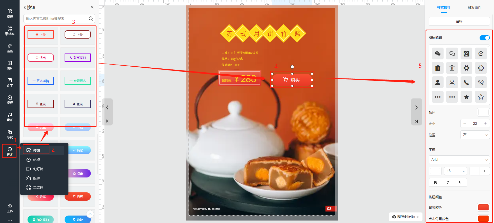 點(diǎn)擊【更多】,選擇【按鈕】,挑選一個(gè)功能按鈕,點(diǎn)擊便會(huì)出現(xiàn)在頁面上,移動(dòng)到合適的位置,雙擊按鈕可以更改文字,右側(cè)可更改其他樣式屬性。
