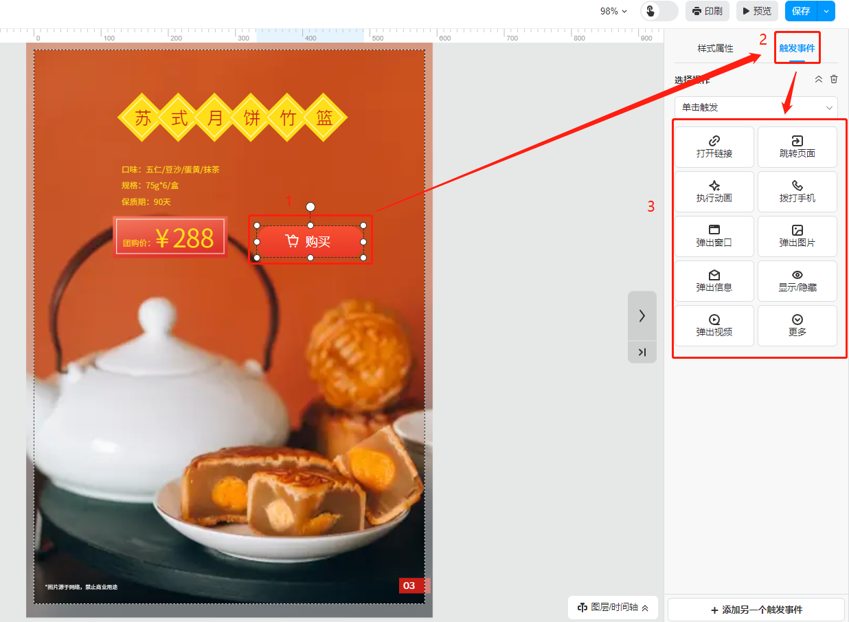 選中功能按鈕,點(diǎn)擊右上角【觸發(fā)事件】,選擇事件。