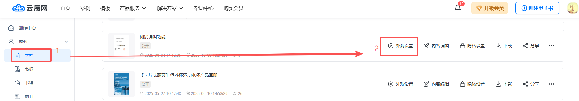 1、在【文檔】頁面,點擊【外觀設置】打開書籍編輯器。
