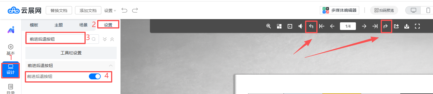 2.點擊設計,點擊設置,在搜索欄輸入“前進后退按鈕”,設置為顯示。