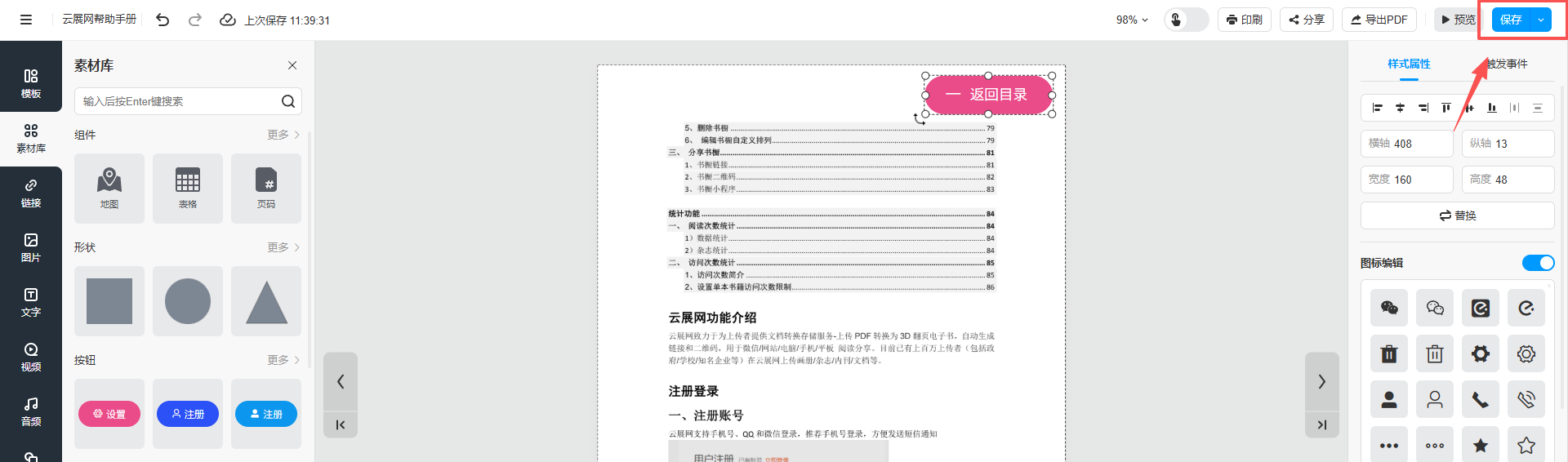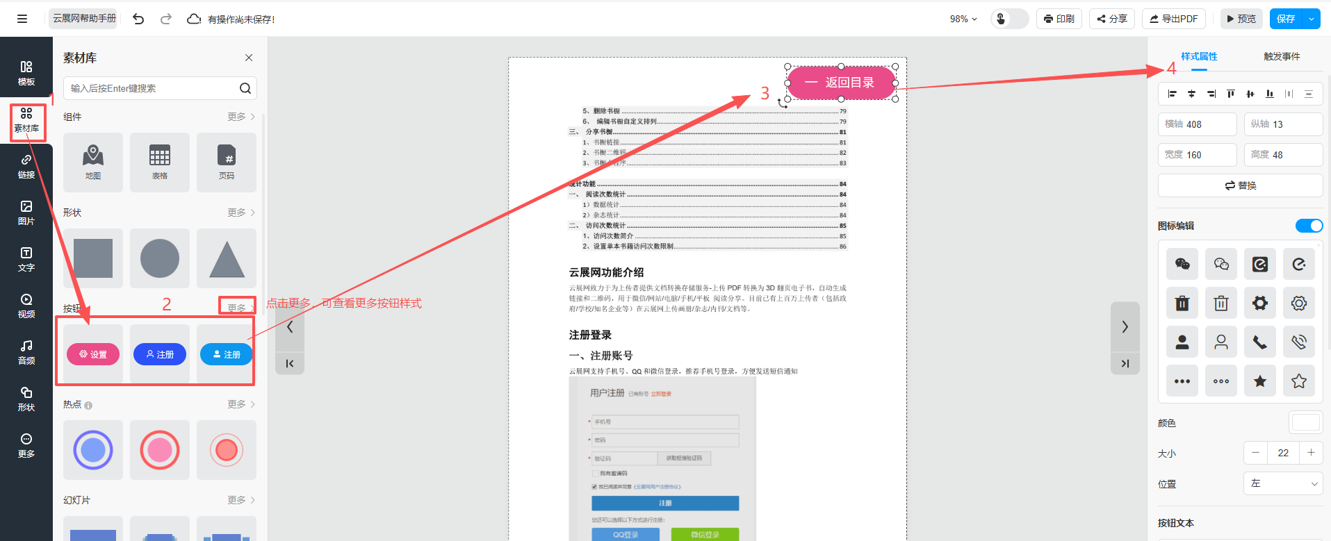 2、點擊【素材庫】,點擊按鈕,在頁面合適的位置添加功能按鈕,雙擊按鈕上的文字將其更改為“返回目錄”,右側可更改圖標樣式和按鈕樣式。