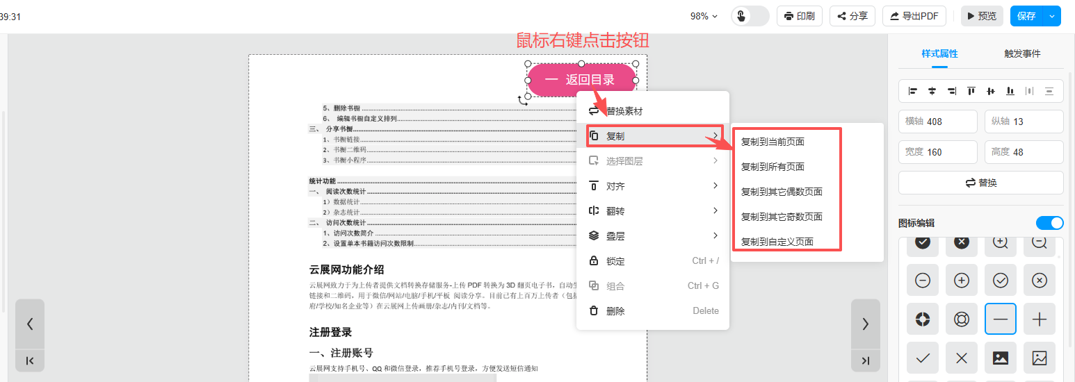 4、右鍵點擊返回目錄按鈕,將其復制到除了封面封底以及目錄頁以外的其他頁面,因為復制的按鈕位置是統一的,所以排版的時候需要在每一頁給按鈕留個位置。