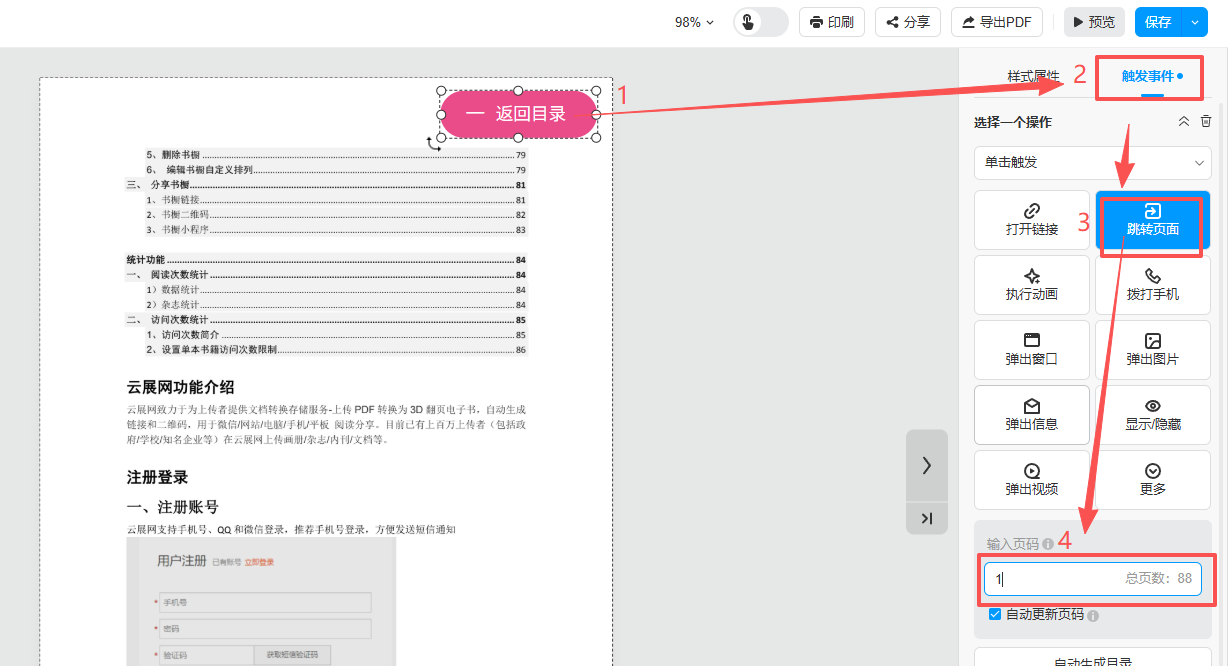 3、點擊返回目錄按鈕,添加【跳轉頁面】的點擊觸發(fā)事件,跳轉頁碼為目錄的那一頁。