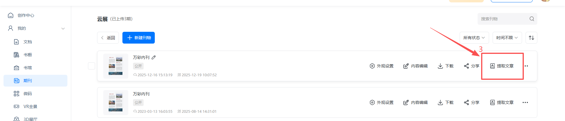 點(diǎn)擊【期刊】,點(diǎn)擊【管理期刊】打開(kāi)后,找到對(duì)應(yīng)的電子期刊,點(diǎn)擊【提取文章】。