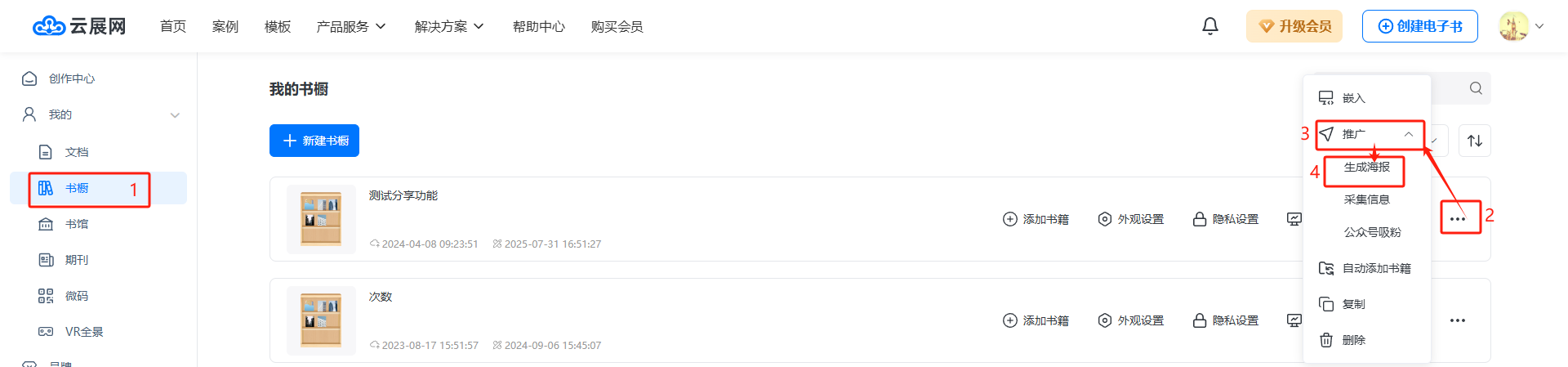 在【書櫥】頁(yè)面,點(diǎn)擊右邊三個(gè)點(diǎn),隨后點(diǎn)擊【推廣】,點(diǎn)擊【生成海報(bào)】。