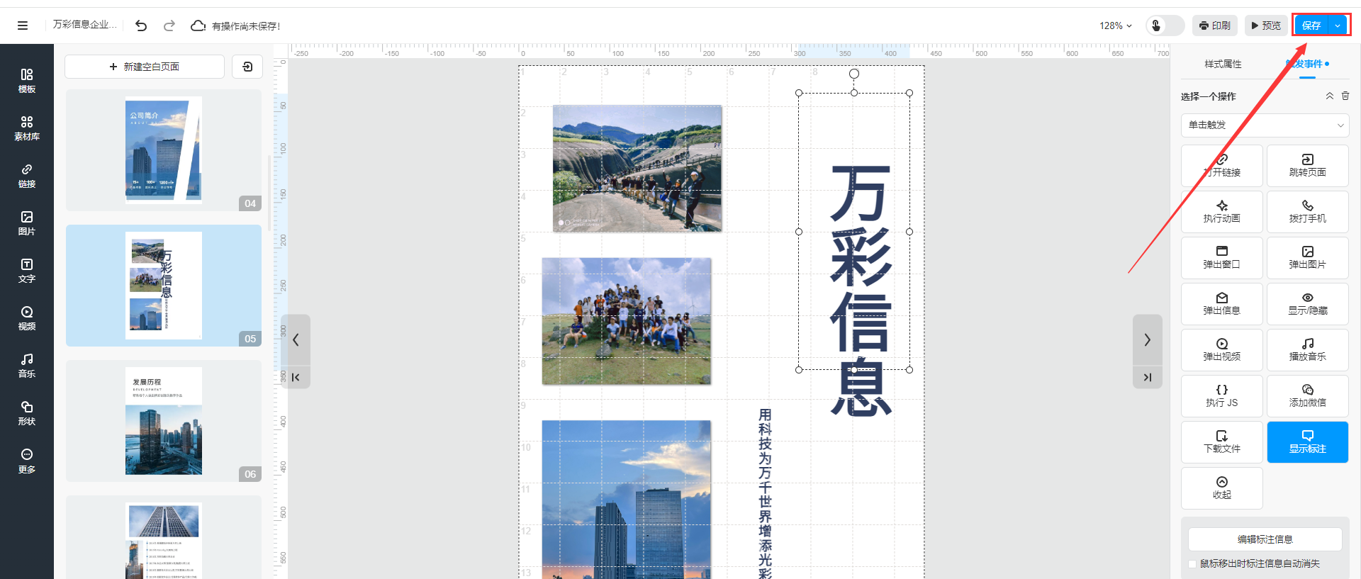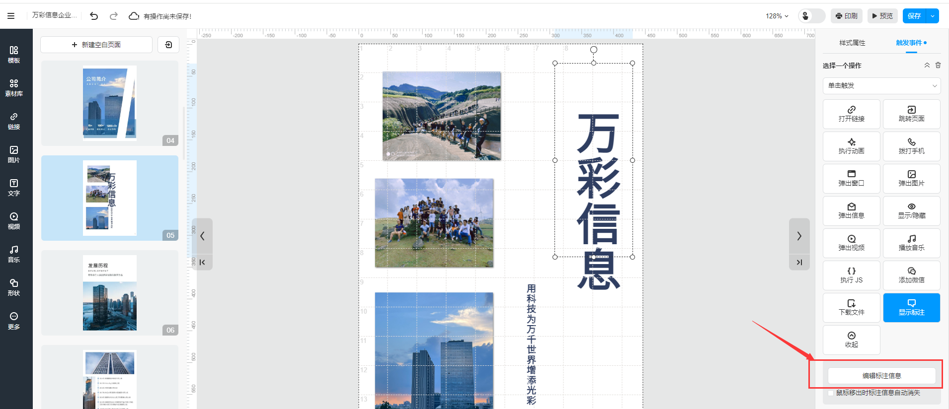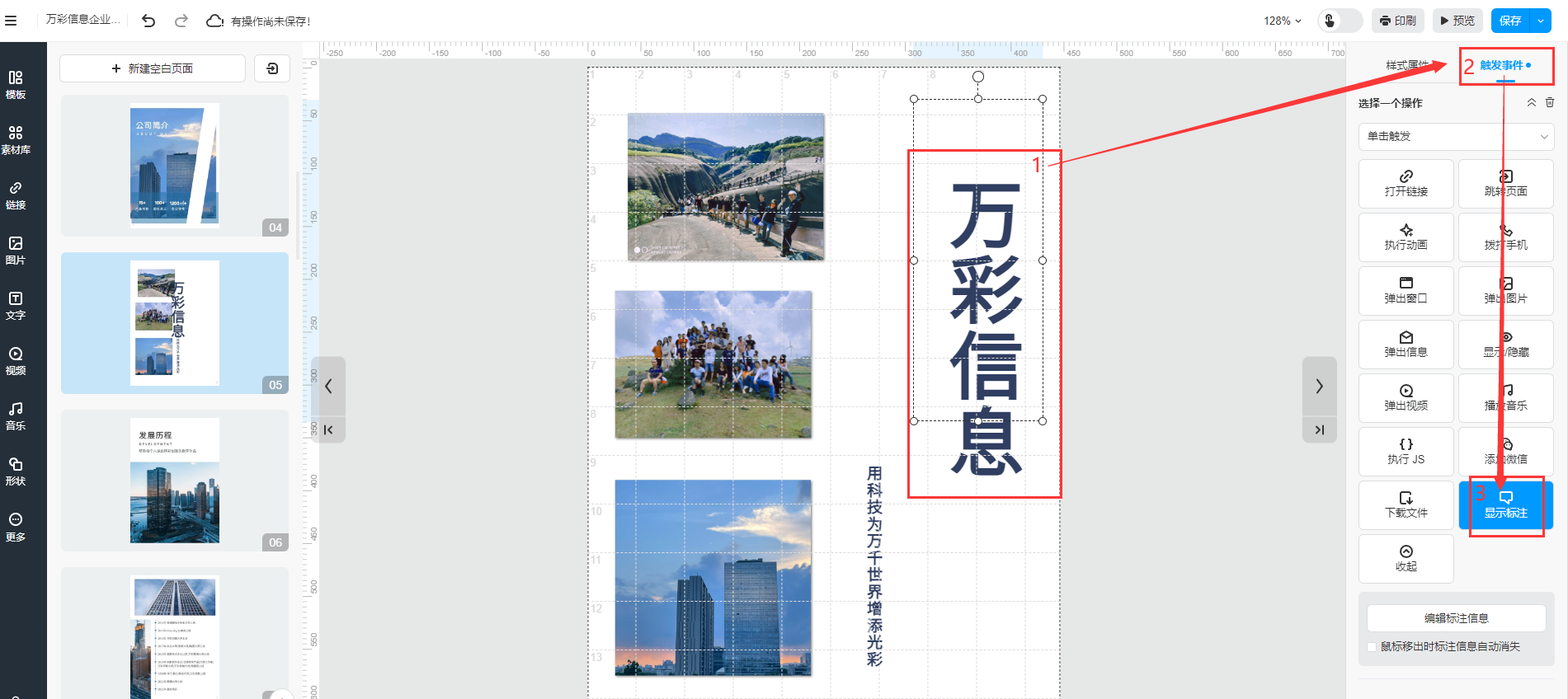 選擇圖片/文字/圖標(biāo),點(diǎn)擊【觸發(fā)事件】,對其設(shè)置【顯示標(biāo)注】功能