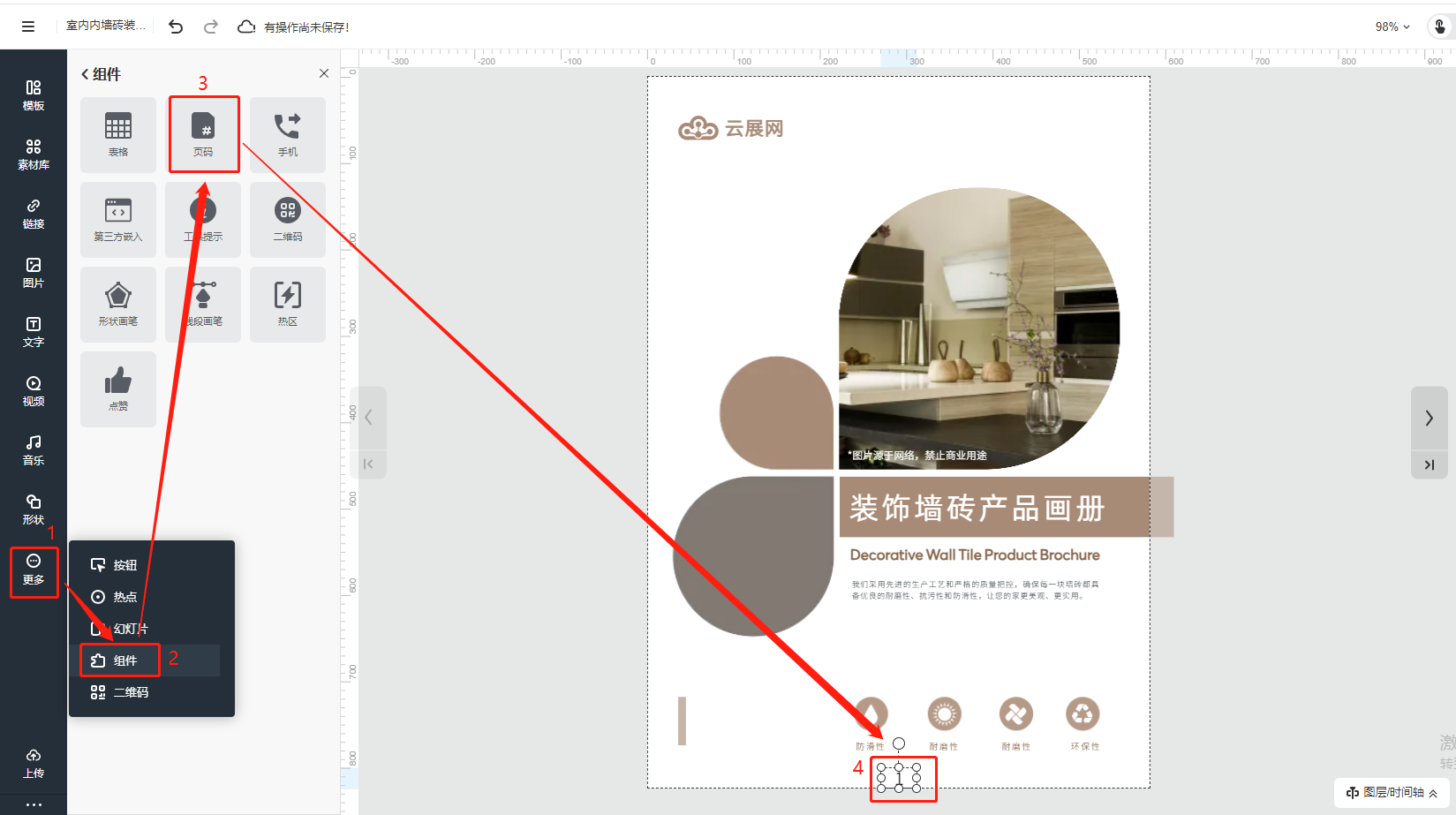 點(diǎn)擊【更多】,選擇【組件】,點(diǎn)擊【頁(yè)碼】,頁(yè)碼會(huì)自動(dòng)按順序出現(xiàn)在所有的書本頁(yè)面上。