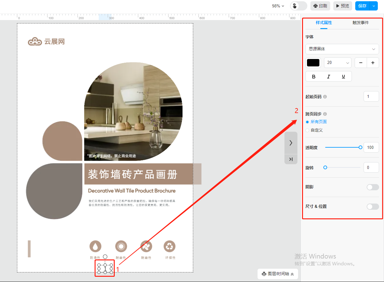 點(diǎn)擊某一頁(yè)的頁(yè)碼,在右側(cè)樣式屬性處可以設(shè)置頁(yè)碼樣式,可以選擇同步所有頁(yè)面的頁(yè)碼或者自定義頁(yè)面的頁(yè)碼。