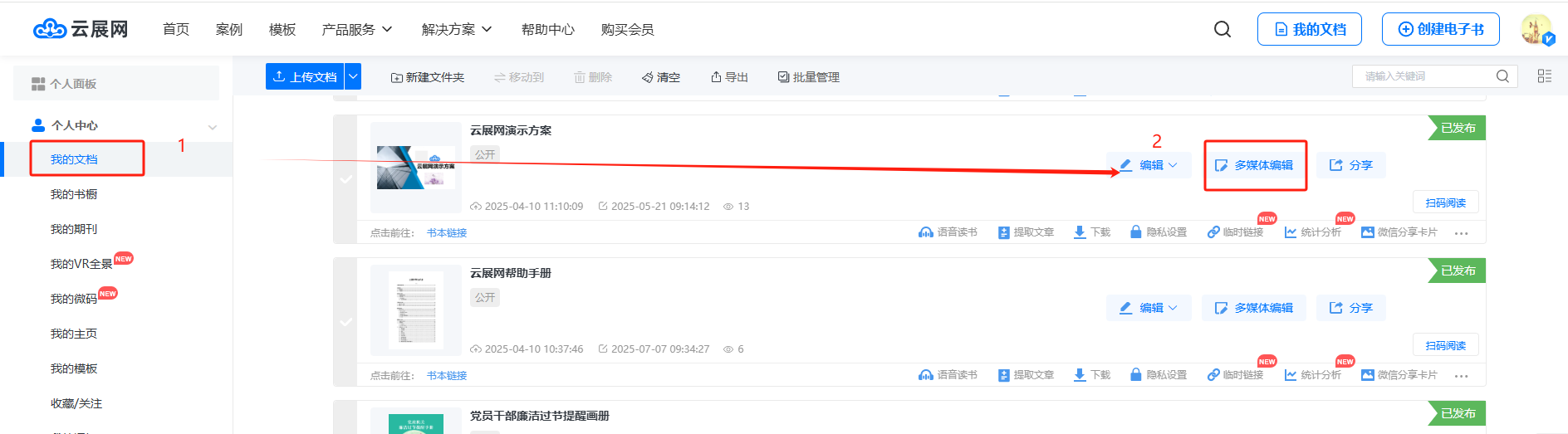 【我的文檔】/【文檔】頁面,找到你想編輯的電子書,選擇【多媒體編輯】/【內(nèi)容編輯】進入多媒體編輯界面。