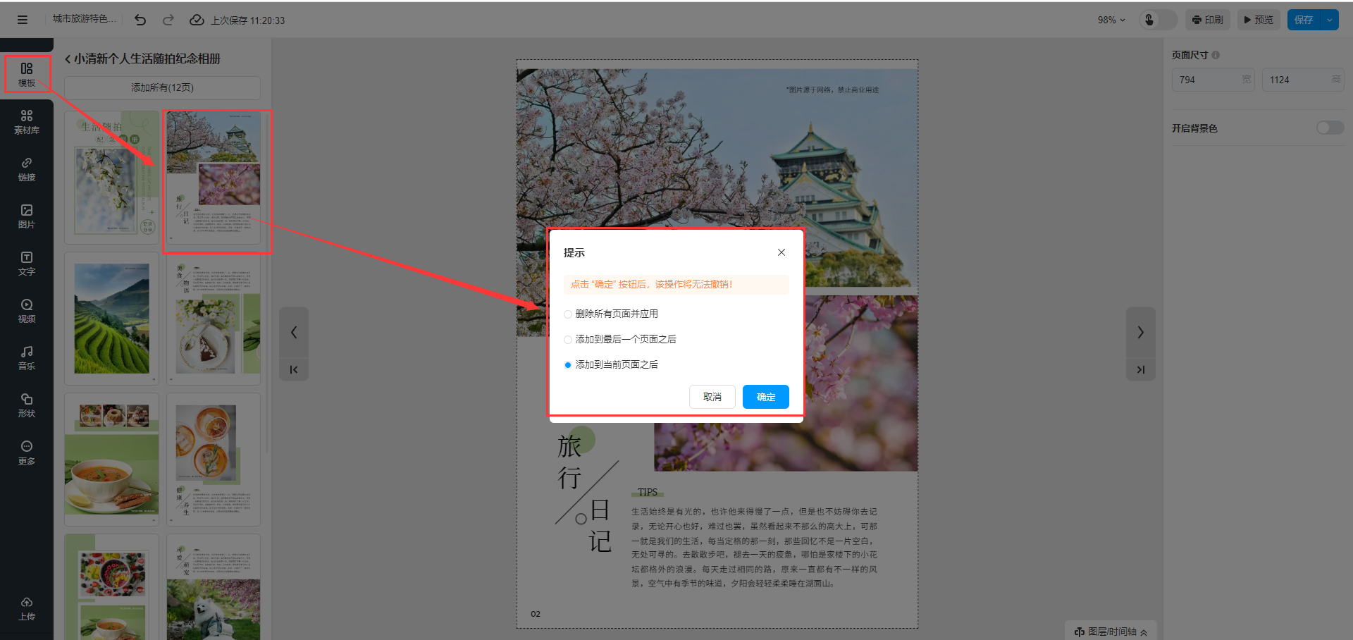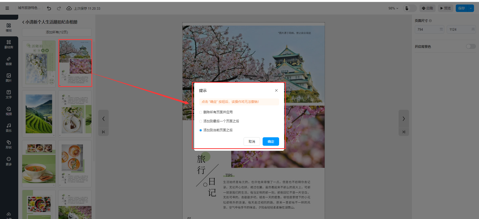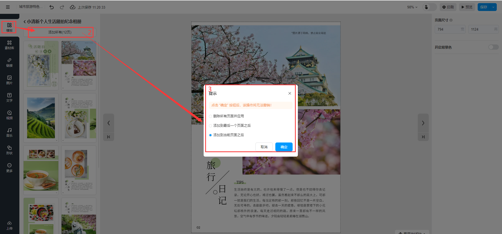 如果你想應(yīng)用模板的全部頁面,可選擇【添加所有頁】,并選擇模板應(yīng)用方式,點擊【確定】。
