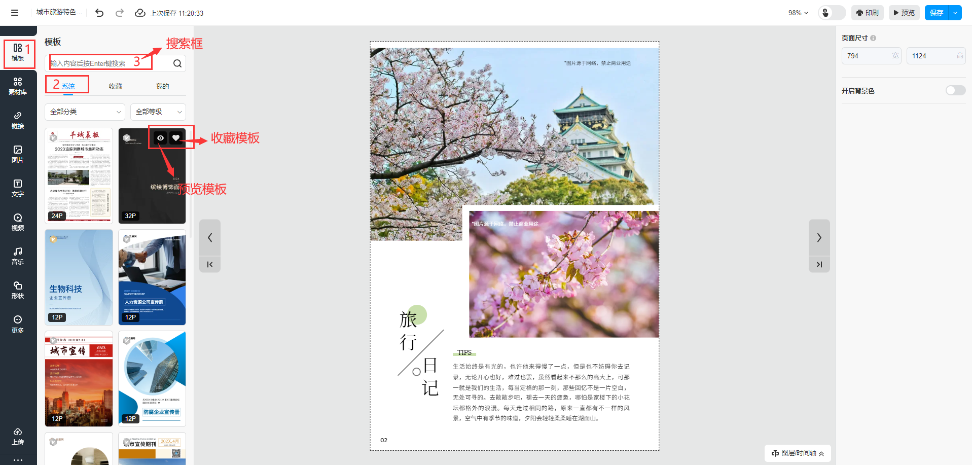 點擊左側(cè)功能欄【模板】,可以通過上方搜索框中直接查找模板,也可以選擇【系統(tǒng)】進(jìn)入系統(tǒng)模板頁面,滑動模板欄選擇心儀模板。