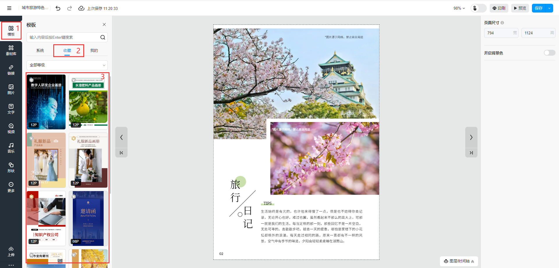 點擊左側(cè)功能欄【模板】,選擇【收藏】進(jìn)入你的收藏模板頁面,滑動模板欄選擇選擇心儀模板。