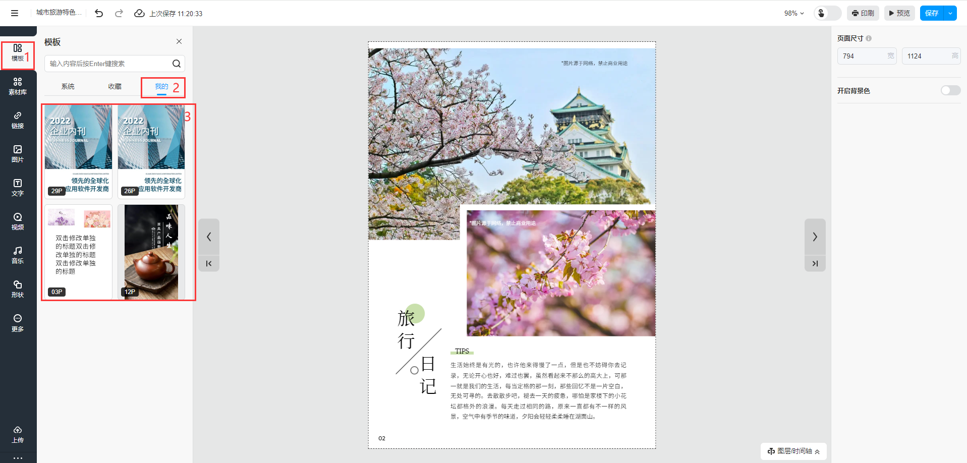 你也可以選擇自制的模板進(jìn)行設(shè)計,之前另存為新模板的所有電子書模板會顯示在【我的】里面。