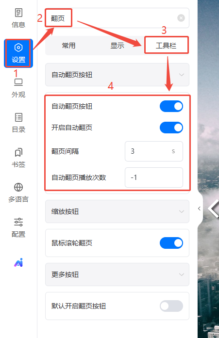 點(diǎn)擊【設(shè)置】,上方搜索【翻頁】,然后點(diǎn)擊【工具欄】,將【自動(dòng)翻頁按鈕】和【開啟自動(dòng)翻頁】都打開,最后再設(shè)置【翻頁間隔】和【自動(dòng)翻頁播放次數(shù)】即可自動(dòng)保存。