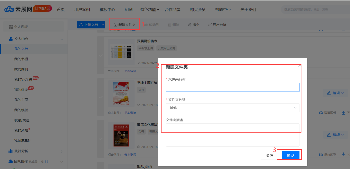 【我的文檔】頁面–點(diǎn)擊【新建文件夾】–輸入文件夾信息–點(diǎn)擊【確認(rèn)】