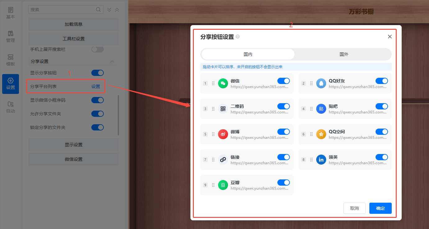 • 分享平臺列表:編輯排列分享按鈕中的國內(nèi)或者國外的平臺列表