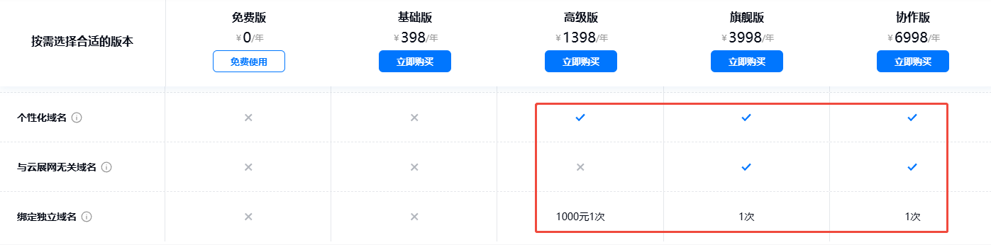 旗艦版和協(xié)作版可以免費綁定一次,高級版可以付費1000元綁定一次,若因用戶個人原因需要更換綁定獨立域名,則需要再次付費。