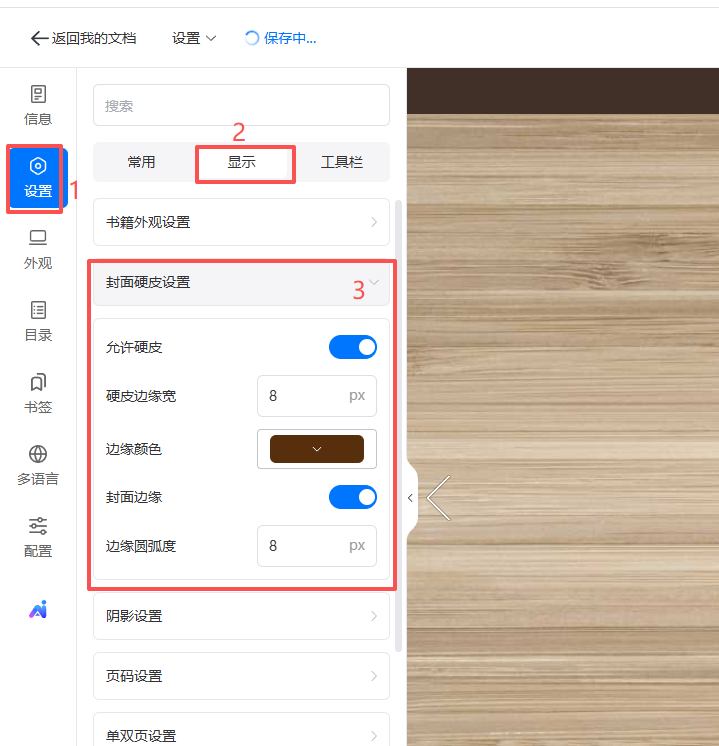 點(diǎn)擊【設(shè)置】,點(diǎn)擊【顯示】,找到封面硬皮設(shè)置,勾選【允許硬皮】,設(shè)置硬皮邊緣寬/邊緣顏色/封面邊緣/邊緣圓弧度。