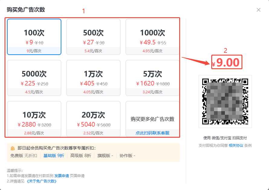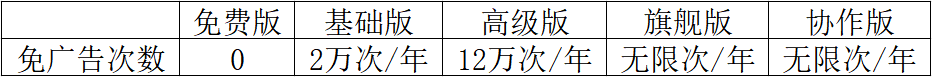 免廣告次數(shù)只在會員期間生效(如2017年5月4日開通一年基礎版,則次數(shù)的有效期為2017年5月4日到2018年5月4日),未用完的次數(shù)到期自動清零,到期前用完次數(shù)的建議升級更高級會員或者單獨充值次數(shù)(詳情請看第四點)。