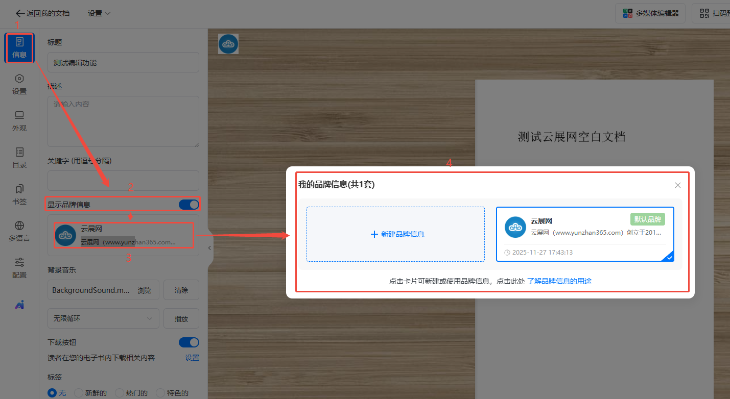 點擊【信息】,打開【顯示品牌信息】,選擇使用一個創(chuàng)建好的品牌信息。