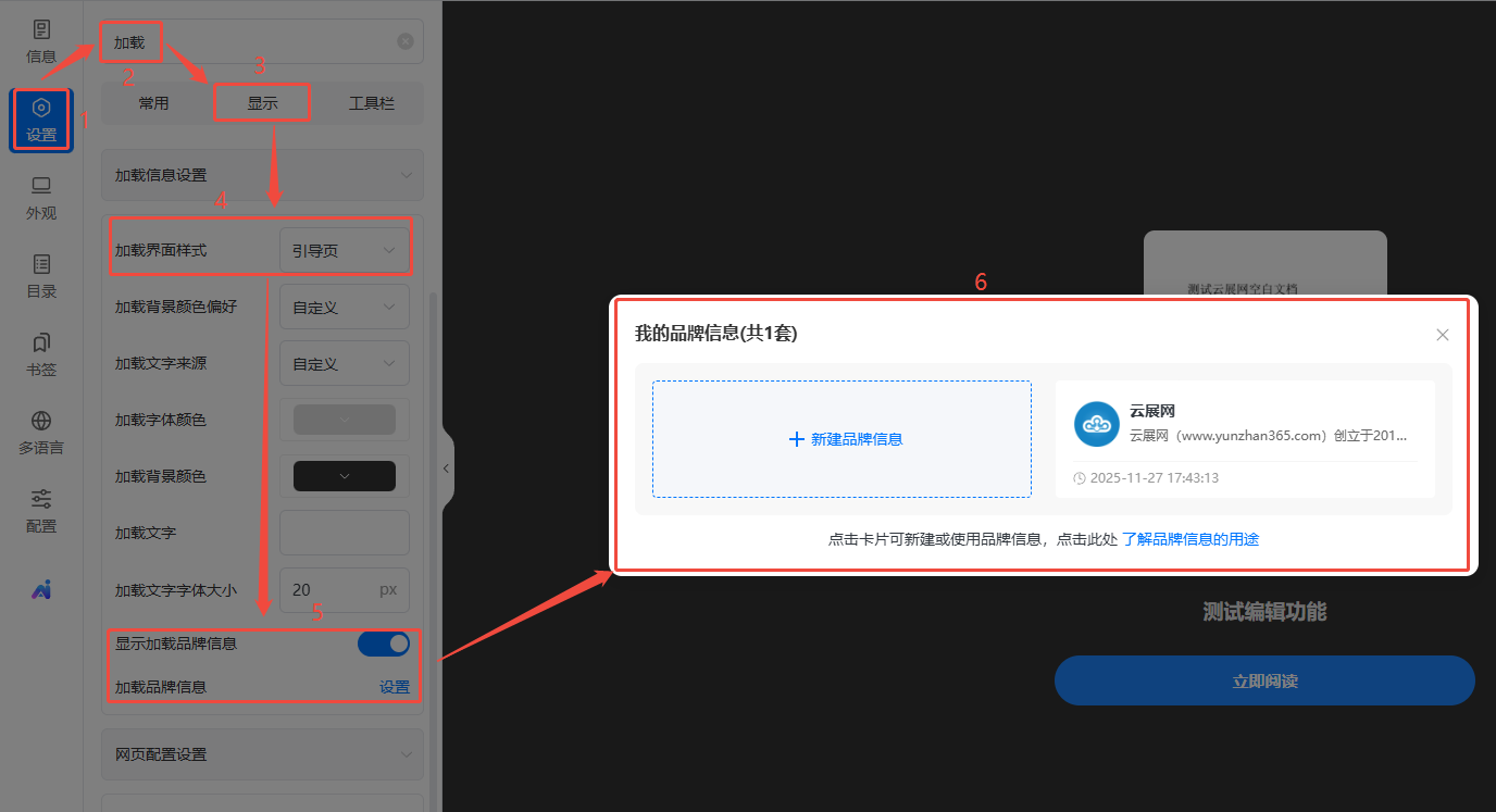 點擊【設(shè)置】,搜索欄搜索【加載】,再點擊【顯示】,將【加載界面樣式】改為【引導(dǎo)頁】,然后打開【顯示加載品牌信息】,最后選擇使用一個創(chuàng)建好的品牌信息。