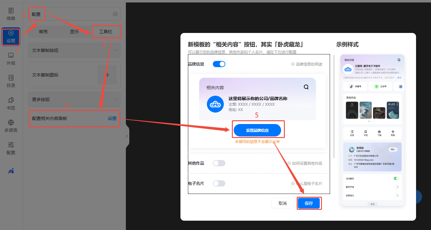 點擊【設(shè)置】,搜索欄搜索【配置】,點擊【工具欄】,設(shè)置【配置相關(guān)內(nèi)容面板】,打開【品牌信息】,點擊【設(shè)置品牌信息】,選擇使用一個創(chuàng)建好的品牌信息,最后點【保存】。