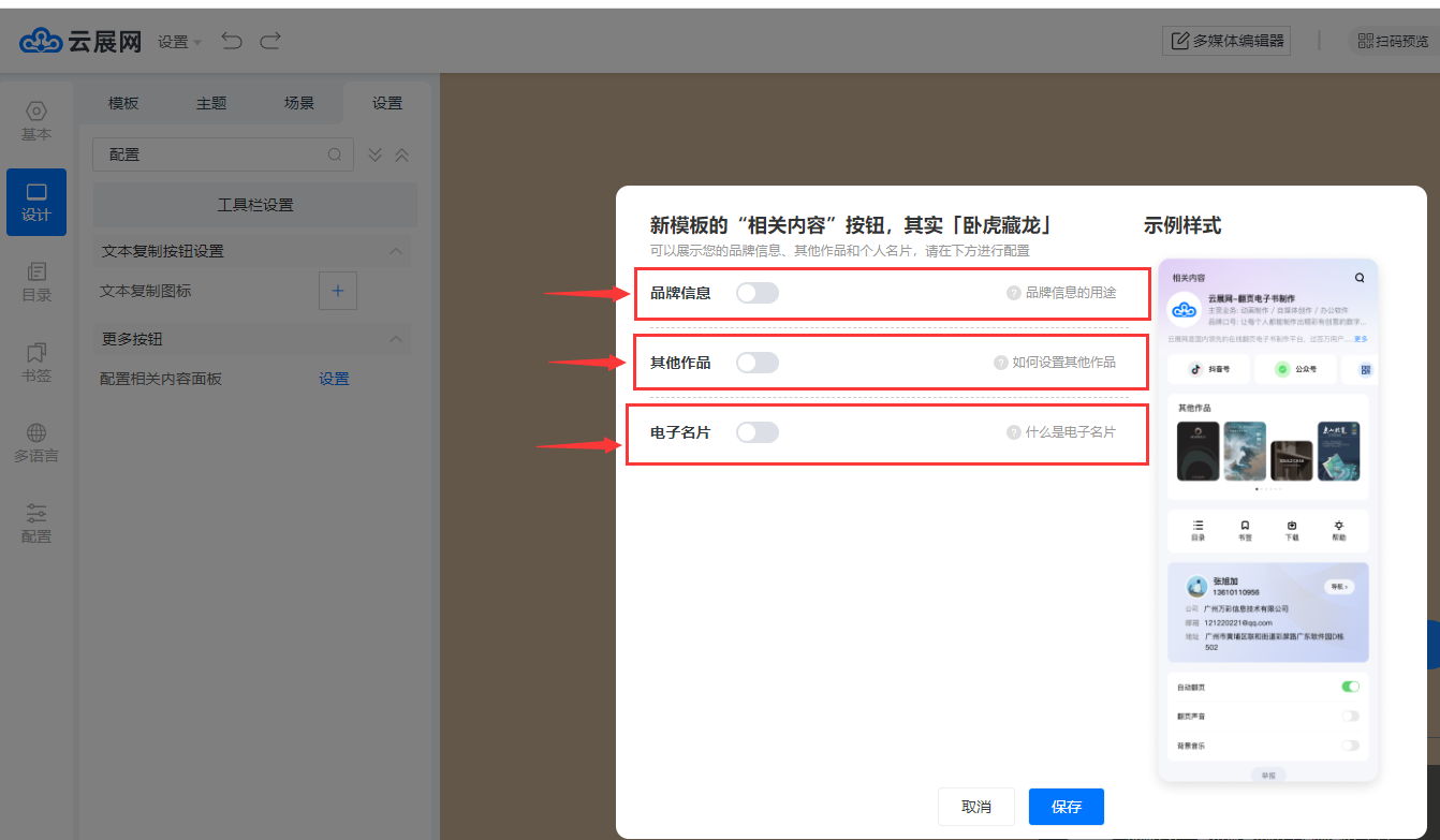 “相關(guān)內(nèi)容”面板功能有三個(gè),【品牌信息】、【其他作品】、【電子名片】