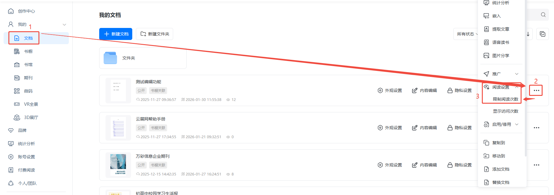 點(diǎn)進(jìn)【文檔】,找到需要設(shè)置閱讀次數(shù)限制的畫冊(cè),點(diǎn)擊【…】選擇【閱讀設(shè)置】,然后點(diǎn)擊【限制閱讀次數(shù)】。