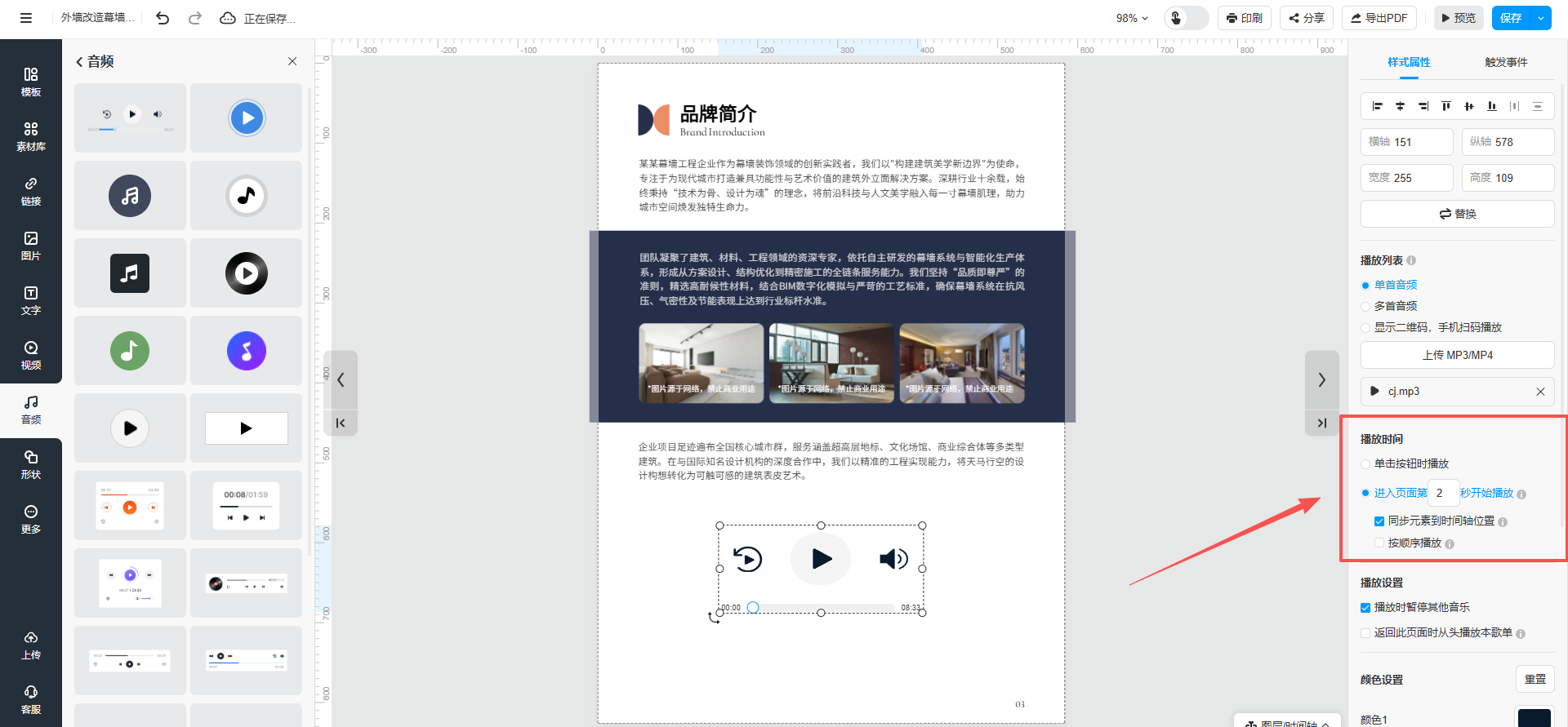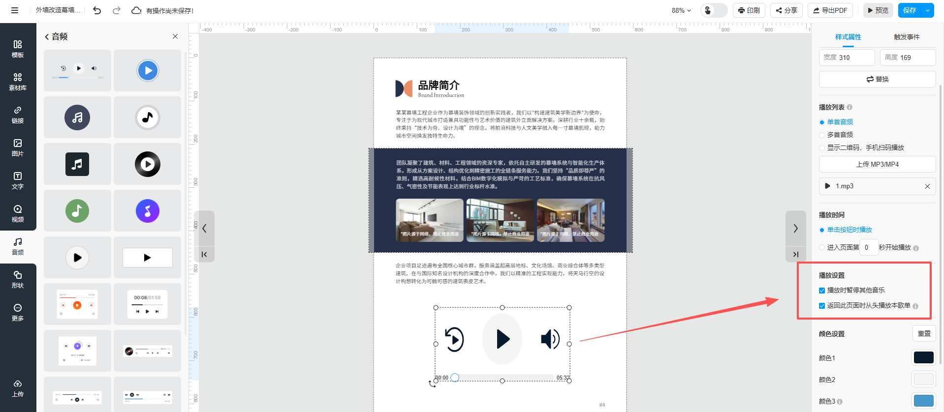 根據(jù)你的需求,在屬性面板中你可以上傳音樂(lè),設(shè)置音樂(lè)播放方式,自定義音樂(lè)控件的顏色、陰影、位置大小以及旋轉(zhuǎn)。