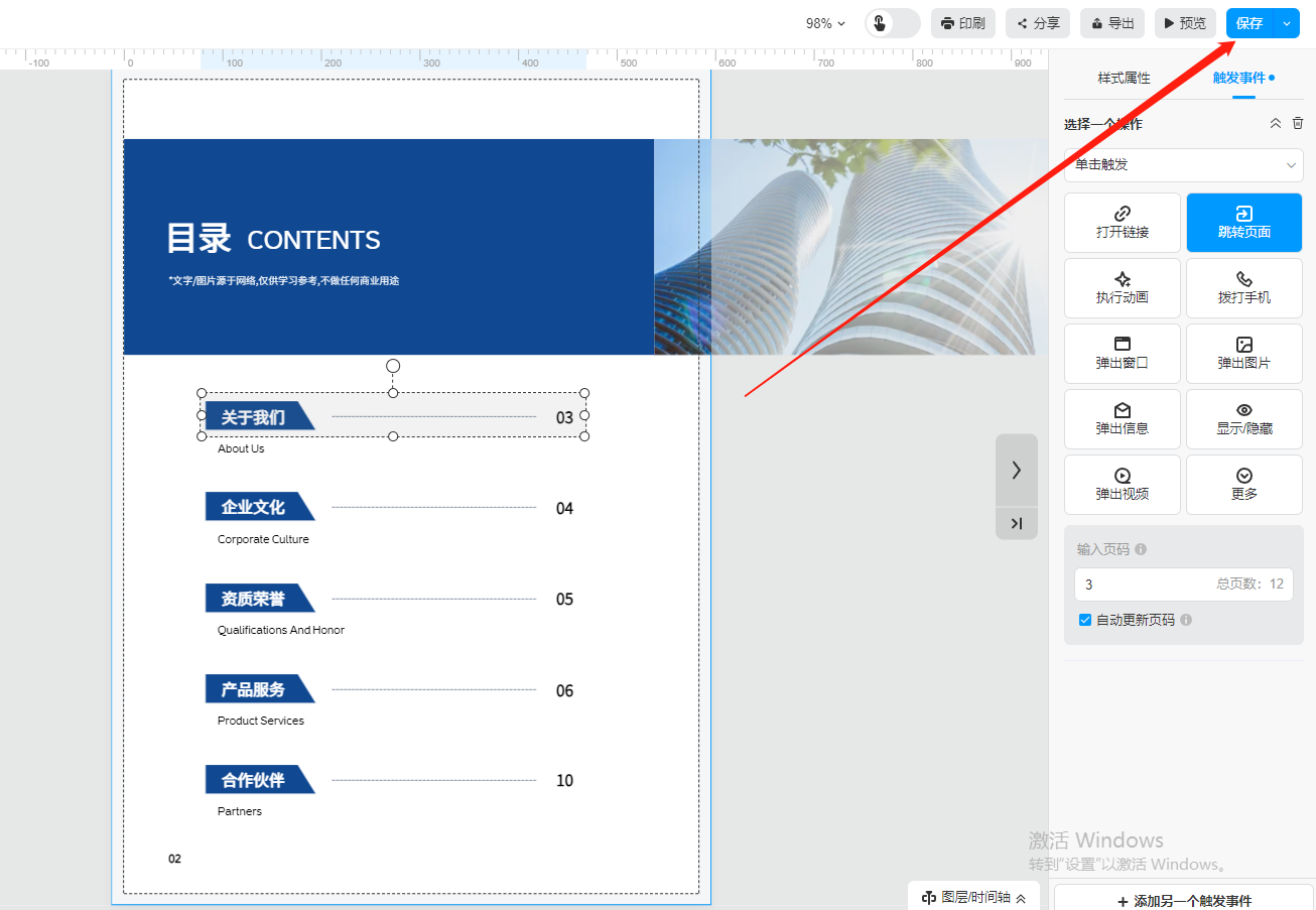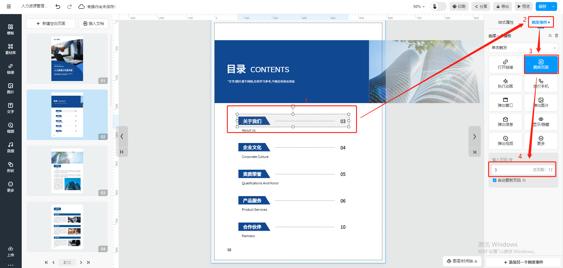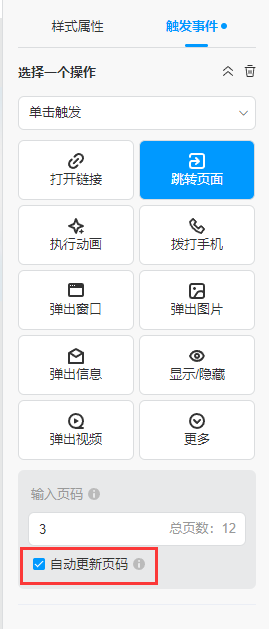 打開【觸發(fā)事件】,【跳轉頁面】,設置需要跳轉的頁碼(頁碼從第一頁開始計算)。