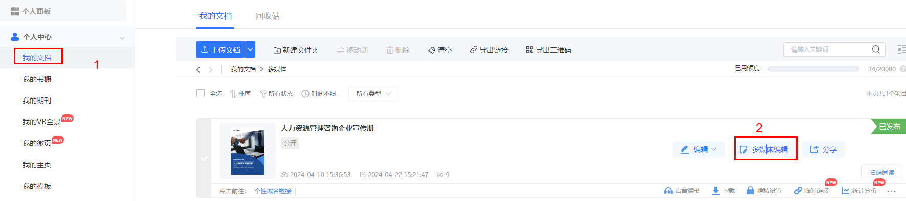 點(diǎn)進(jìn)【我的文檔】/【文檔】,選擇對(duì)應(yīng)電子書(shū),點(diǎn)擊【多媒體編輯】/【內(nèi)容編輯】。