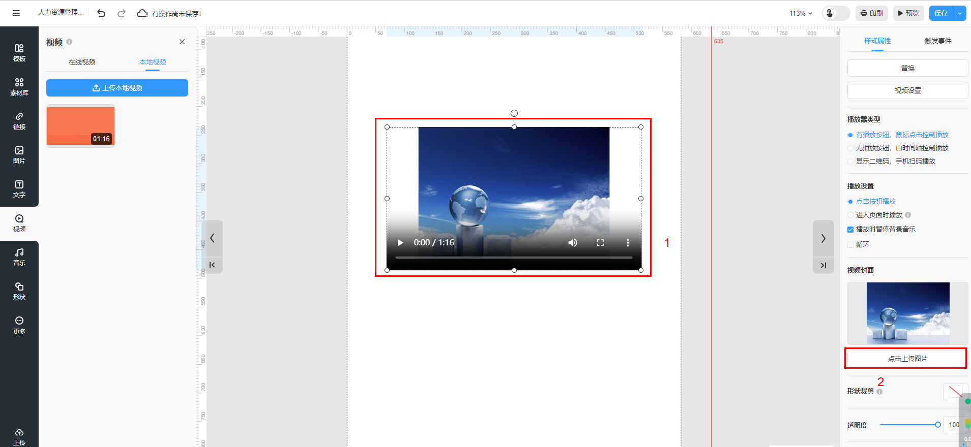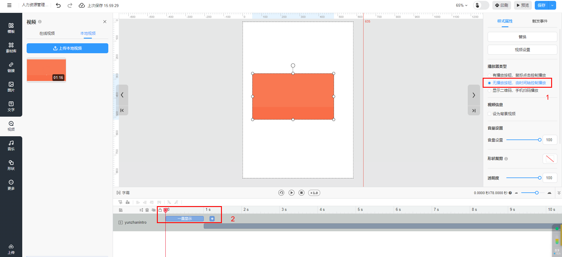 溫馨提示:【無(wú)播放按鈕,由時(shí)間軸控制播放】?jī)H支持上傳本地視頻類(lèi)型勾選。