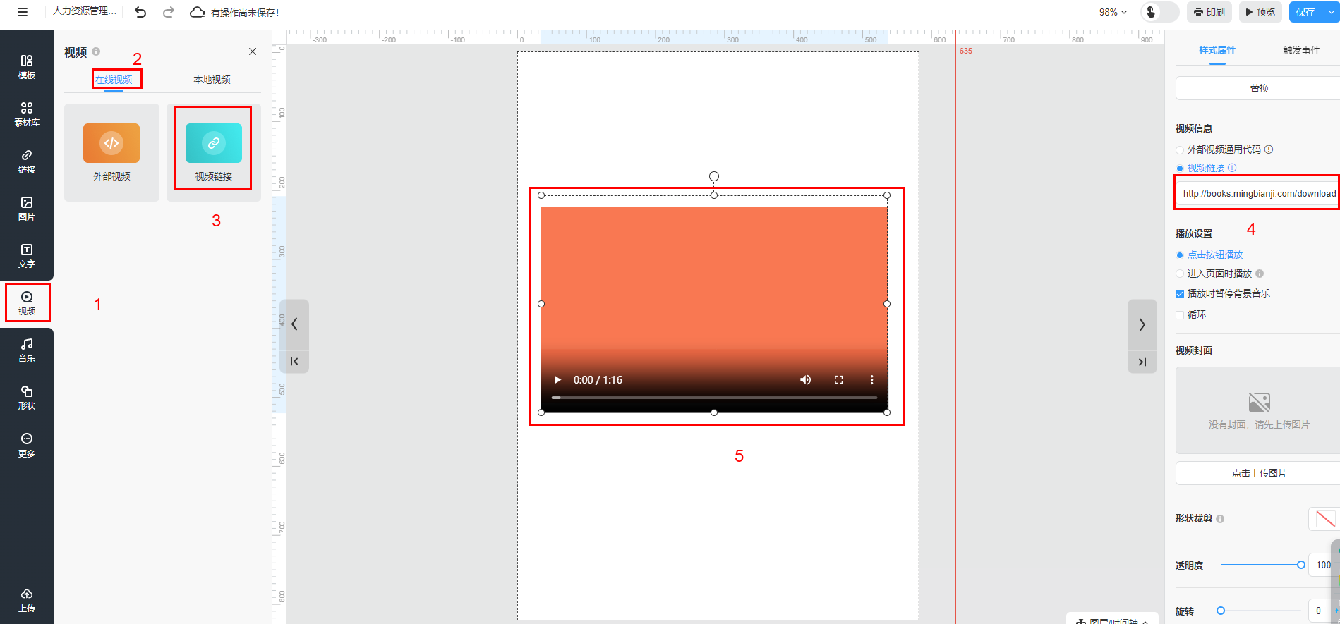 點(diǎn)擊【視頻鏈接】將視頻框放至畫(huà)布,調(diào)整視頻框的位置和大小,將你的視頻鏈接輸入到【視頻鏈接】
