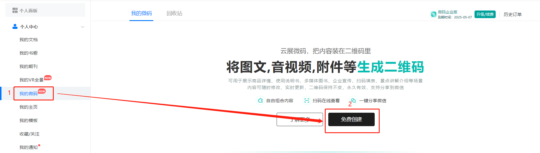 點擊【我的微碼】,然后點擊【免費創(chuàng)建】。