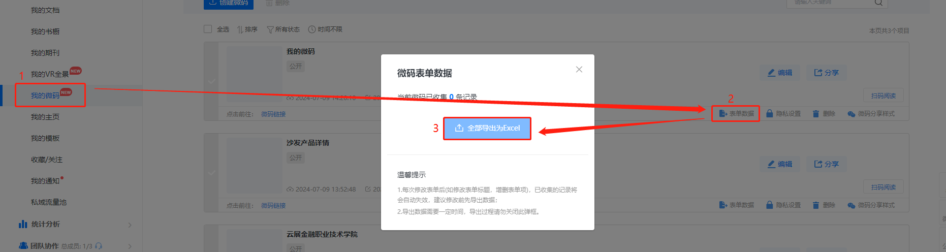 點(diǎn)擊【我的微碼】,然后點(diǎn)擊【表單數(shù)據(jù)】,最后點(diǎn)擊【全部導(dǎo)出為excel】,即可查看收集到的數(shù)據(jù)