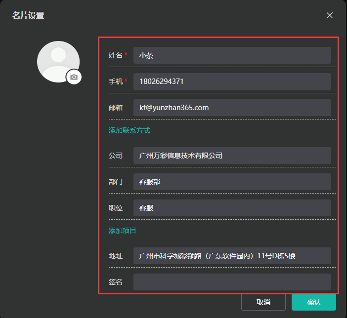 輸入名片信息,點(diǎn)擊確認(rèn)。