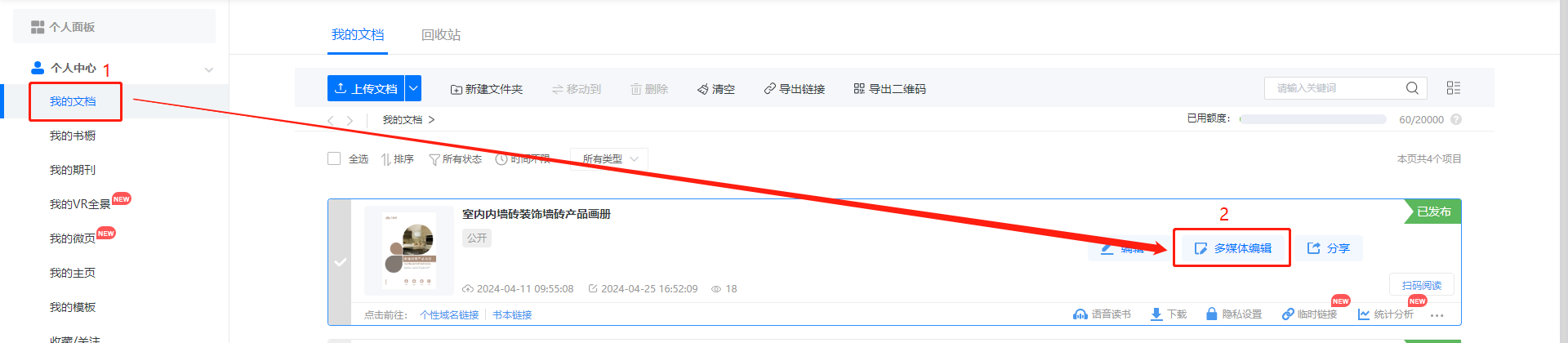 點(diǎn)進(jìn)【我的文檔】/【文檔】,選擇對(duì)應(yīng)電子書,點(diǎn)擊【多媒體編輯】/【內(nèi)容編輯】。